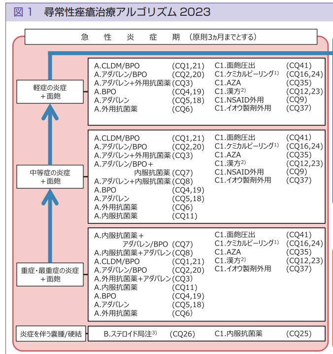 2.)日本皮膚科学会ガイドライン:尋常性痤瘡・酒皶治療ガイドライン 2023. 日本皮膚科学会雑誌, 133(3), 407-450, 2023. https://www.dermatol.or.jp/dermatol/wp-content/uploads/xoops/files/guideline/zasou2023.pdf