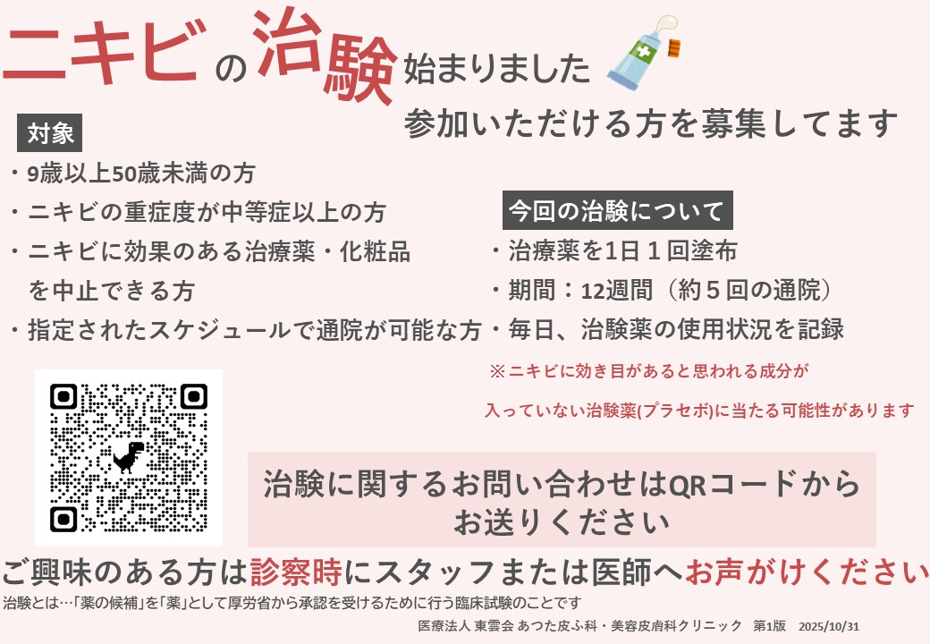 当院では、尋常性ざ瘡(ニキビ)に対する新しい治療法の開発を目的とし治験を実施しており、ご参加いただける方を募集しています。